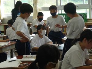 B組理科では、教科担任からの問いかけに 生徒たちが笑顔で反応します。「反応」は問いかけに対してのみならず、仲間の発言に対しても積極的です。なんとも和気あいあいとした雰囲気の中、授業は進みゆきました。