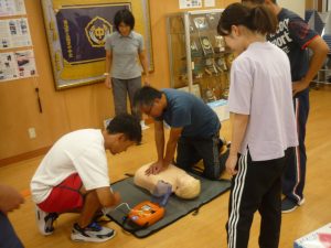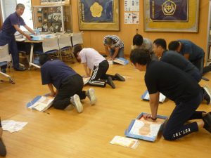 第二部は「救急救命(心臓マッサージやAED等)」についての研修でした。消防署から講師をお招き、人体模型を使っての心臓マッサージやAEDの装着などを実際に体験しました。