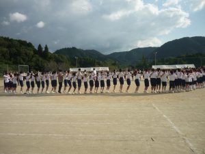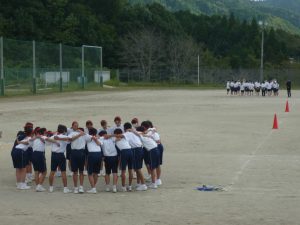 前半の種目練習を終え、後半の係会(会場準備)も終えた後、生徒会執行部を中心に全校で明日の打合せを行った。さて解散!となるその前に、紅白両軍長から声がかかる。「全校で円陣を組もう!みんな輪になって!」という声だった。紅白、そして職員も入り混じって円陣を組み、皆で勝利を呼び込む魔法の言葉(?)を叫び続けた。明日は紅白に分かれ競うことになるが、間違いなく私たちは南中の仲間! みんなで力を合わせ、Next One! な体育祭をともに創り上げるべき仲間なんだ!というメッセージが、やや雲の多い秋空に、混じり気のない音質で響き続けていた。