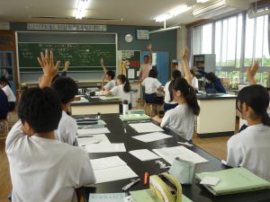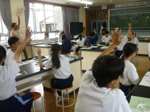 教科担任の質問に対し、必要に応じて仲間と相談し、いきおいよく挙手する生徒たち。意欲的です。