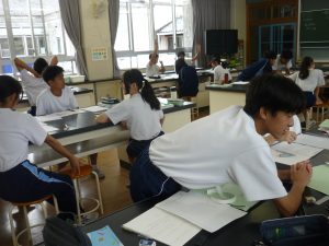 一人が指名され、発言します。その意見を聞きながら「うん、うん」とうなずく生徒たち。が、教科担任はそれを100%よしとはしません。「でもさあ・・・」と、さらなる思考を要求します。その要求を受け、再び生徒たちの相談が始まります。
