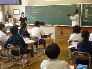 A組英語の授業にて、ALTのクリス先生の顔を 穴が開くほどじっと見つめ、話に耳を傾ける生徒たち。話されているのはもちろん英語。生徒の様子を見ながら、身振り手振りを交え、表情豊かにspeaking! その話が終わった時です、あちこちからつぶやきが聞こえてきました。「そういうことかぁ」「ああ、だからかぁ」といったつぶやきでした。そのつぶやきは、クリス先生のAll English を聴き取れたことの証しでもありました。