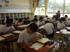 同じ時間、B組は国語で「動詞の活用」を勉強していました。ややこしい・・・と、苦手に感じる者の多い単元です💦 練習問題を、まわりと相談し、教科担任に助言してもらいながら解いてゆきます。まだまだ間違いも散見されますが、まあ、それが普通。致し方なしですね。