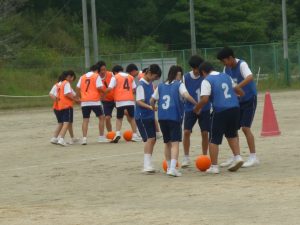 明らかにテンション高めに運動場へと出てゆく生徒たち。体育で「サッカー」の学習が始まりました! 本日のメインはミニゲーム。班ごとに手を繋いで円になり、その真ん中に2つのボールを置いて競争したり、攻・守+ゴールキーパー役を順々に務めながらの超ミニゲームに興じたり・・・男子も女子もちゃ〜んとボールに触れながら、歓声をあげつつ楽しそーに取り組んでいました。受験期の3年生にとって、運動機会の確保は何げに大事です。こんなふうに楽しんで一生懸命に、そしてチームワークよく取り組み続けることができたなら、体育の授業は生徒たちの心にも好影響を与えることでしょう ⚽️