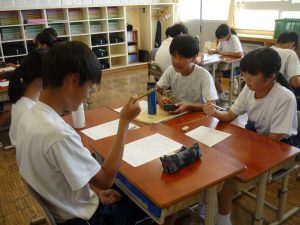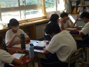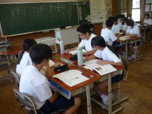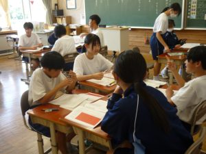 道徳資料『書道パフォーマンスの挑戦』を読みながら、「伝統や文化の継承と発展」という視点で考えました。たとえば南中校区には、陶町・稲津町ともに大切にしている「狂俳」という文化があります。が、それをよくは知らないという生徒も案外多く・・・そこで、狂俳づくりのルールを学び、実際に詠んでみることにしました。指折り数えて句を整えんとする生徒たちは、その時確かに、地元の伝統・文化に興じていました。伝統・文化の継承と発展を願うなら、まずは知ること、そして興味をもつことなのでしょう。
