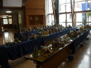 5・6月、特別講師に保母先生をお招きして行った粘土作品の作製。今、それが焼き上がり、多目的ホールにずらりと並べられています!(保母先生、焼成をありがとうございました!)眺めれば、生徒それぞれの興味や趣向が際立ち、しばし時を忘れひとつひとつに見入ってしまいます。「芸術の秋」・・・いいもんです。