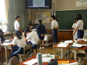 B組社会では、公民用語の端的な説明に挑戦しました。理解が不確かだと説明は冗長なものになりがちです。端的な説明の裏には、確かな理解があるのです。班で説明の仕方を相談しながら、生徒たちは個々に、端的な説明=確かな理解を目指していました。