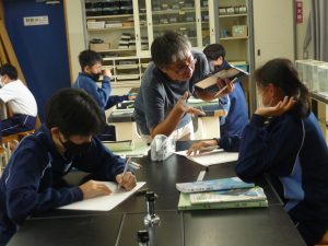 A組理科で「浮力の大きさは何によって決まるのか」を考えました。知識をフル活用し、予想を立てる生徒たち。その様子を見ながら机間を回る教科担任が、一人一人と対話します。「うん、分かる。じゃあさあ・・・」「あ、これ、いいとこ目つけてるよ。だから、どうなる?」などの問いかけに、生徒たちは説明を試みます。結果、予想は徐々に深まり核心へと近付いて・・・。