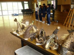 昼休みの多目的ホール。粘土作品の傍らで、合唱部の3年生4人が歌っています。