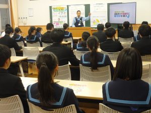 本日は瑞浪交番の松田所長を講師にお招きし、主に自転車の乗り方についてご講話いただきました。講話の中で強調されていたのは、反則金うんぬんよりも、自分の命を自分で守る大切さです。ヘルメットの着用は努力義務ながら、「必ずかぶってほしい!」と強調される松田所長でした。来年度から始まる新生活、生徒たちには引き続き笑顔で過ごしてほしいものです。