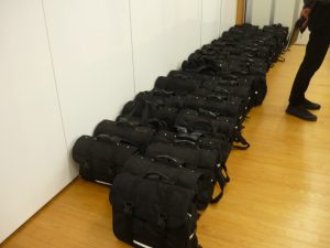 さて、話はかわりますが、この講話は放課後に行われ、生徒たちはすぐに下校できるようカバンを持って研修室に集まりました。「カバン、後ろに置いた方がいいんじゃない?」という一人の声に皆が賛同し、並べられたカバンは下の通りでした。