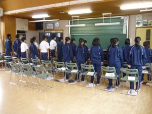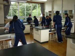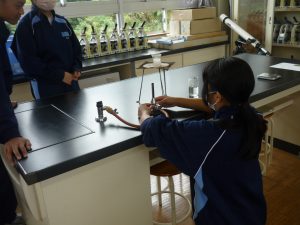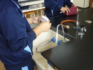 B組理科で「状態変化」の実験をしました。ろう(固体)が熱され液体になった時、その質量は?体積は?という実験です。「じゃあ、実験を始めようか」という教科担任の言葉で、生徒たちはきびきびと準備を始めます。まず行ったのがイスを机の下にしまうこと。ササッとパパッと、一瞬のうちにイスがしまわれます。ふと見れば、濡れ雑巾を準備する生徒が各班にいます。イス引きも濡れ雑巾も、実験を安全に進めるための大切な準備なのです。その後、マッチを擦りガスバーナーに点火したのですが、その練習をしたのは、確か9月の初旬頃でした。本日、全員がマッチを一発で擦れたわけではないものの、9月に見られた躊躇や戸惑い、困惑といったものはすっかりなくなっていました。