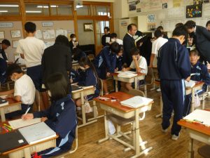 全校職員と東濃教育事務所&瑞浪市教育委員会の指導者が見守る中、1Aで数学の研究授業が行われました。学習したのは「反比例」。表やグラフから反比例の式を導き出すことに挑戦です。授業の中には「自分でじっくり考える場」「仲間と相談する場」「人に説明する場」「全体に発表する場」「実際に練習問題を解く場」があり、さらには「ゔっ💦 と考え込む場」「あっ、そうか💡とひらめく場」がありました。