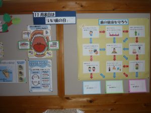 11月8日は「いい(11)歯(8)の日」。今、保健室前には「歯の健康」に関わる掲示物が貼られています。