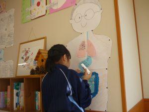 I組理科で「人体」の勉強をしています。画用紙を各内臓の形に切り抜き、その働きを調べてまとめ、今日はいよいよ、白い画用紙で作成された “空っぽの 人体模型” に貼り付けました。それぞれの内蔵がどこにあるか、確認しながらの貼り付けです。ちなみにこの “空っぽの人体模型” は、I組の学級担任を模してあるとか。なるほど、確かにメガネをかけています。さらに言えば、I組生徒の学習ぶりを、にこにこ笑顔で見つめていますね 🤓