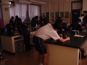 2時間目。A組は理科でした。真っ暗な理科室で「光の反射」の実験です。