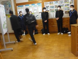 さて、下の写真は朝の生徒玄関です。登校してきた生徒会執行部とボランティア部の面々が、マスクをして挨拶運動をしています。欠席者の多い今、それでも学校の活動を絶対に絶やすまいと踏ん張る、そんな志を感じます。(ここに写る生徒たちに限らずですが、1cmの主体性があちこちで自然に見られる南中⋯素敵な学校です。)