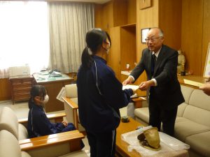 さて、両作品が飾られ一年間が経過し、先日、作品返却のために教育長さんがわざわざ来校されました。「この作品を見て、驚き感心される方が何人もいらっしゃいましたよ」と、感謝の言葉を伝える教育長さん。心碧さんと明日菜さんは若干緊張しながらも、笑顔で話を聴きました。教育長室に彩りを添えてきた二つの作品が、今、製作者の手元に戻ってきました🤗