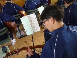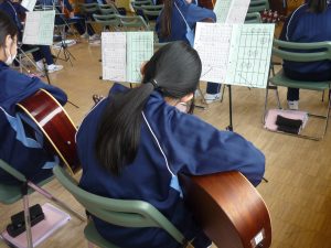 合唱祭で素敵なギター演奏を披露した3年生。あの時発表したのは「カントリーロード」と「空も飛べるはず」の2曲。和音を奏で、見事に弾き語りました。あれから約3週間が経ちますが、音楽授業の行われる音楽室には、今もギターの音色が響きます。現在、生徒たちが取り組むのはド・レ・ミ⋯と音階を奏でる練習。「かえるの歌」「きらきら星」「ジョイフル・ジョイフル」を練習曲とし、ゆっくりと、でも確実に音を出す生徒たち。そう、合唱祭は終わりましたが、生徒たちは新たな課題を追い、学びを止めることがありません ♬ 学びを重ねるその姿には、Next One の志が透けて見えます。