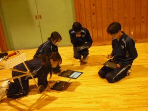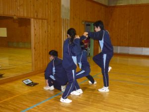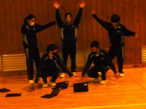 下は、A組体育授業の様子です。体育では、前時から『ダンス』の学習に入りました。始めて2時間目にも関わらず、基本となるステップがもう踏めています。本時は班ごとに、いきなり “決めポーズ” を考える学習、言ってみれば “魅せる” ための学習に取り組んでいました。1・2年生時代にもダンスは学習しています。本時の学習は、その積み上げの上に成り立っていました。