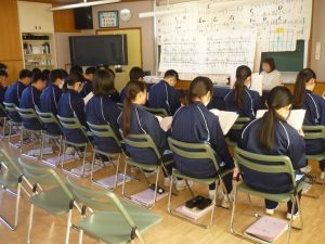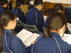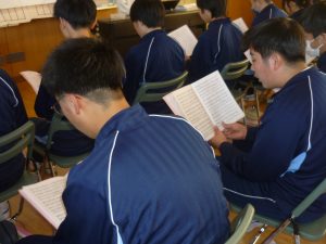 下は、B組音楽授業の様子です。卒業式で披露する “最後の学年合唱曲” 『友 〜旅立ちの時〜』の音合わせをしていました。初の音合わせでしたが、教科担任いわく “奇跡の音合わせ”! 培ってきた基礎がしっかりとしているからでしょう、これぐらいの難曲でも自然とハーモニーが紡ぎ出されます。生徒たちの積み上げが、ここにも透けて見えました。