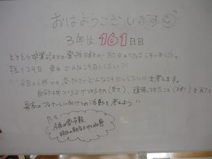 上は、3年主任による『日刊ホワイトボード通信』です。写真は不鮮明ながら、卒業式までの登校日数が残り29日になったこと、これまでにつくり上げてきたもの(良さ)と頑張ってきたこと(誇り)をもとに最高のフィナーレに向かいたいこと等が、熱く記されています。中学生活も残り29日。逆に言えば、生徒たちは “中学生時代” をそれだけ重ね、積み上げてきたわけです。