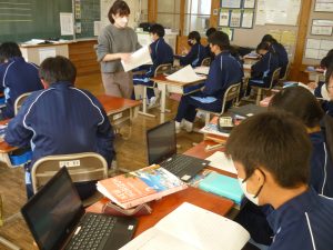 英語では、動画で観た少年に返信するという想定で学習を進めています。現在そのための原稿を(もちろん英語で)書き終えるところまで来ました。で、本時は仲間が書き上げた原稿にコメントを添える学習でした。書かれた英文を読み、意味を解し、英文でコメントを添えてゆきます。英文を通じ、動画の少年とも周りの仲間ともコミュニケーションをとっている、そんな様相です。