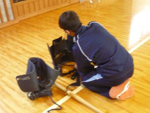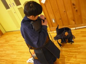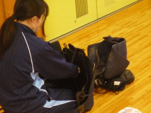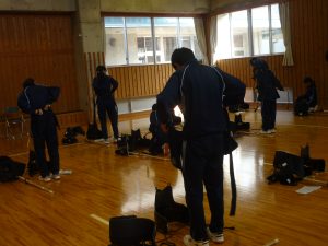 体育の授業で剣道に取り組んでいます。基礎練習が進み、いよいよ実践練習に入る段階にきていますが、そうすると、防具をすべて身につける必要があります。よって本日は、その練習をしました。まずは防具を揃え、身の回りに置きます。「面」は金具で覆われた部分を下に、並べた「小手」の上に静かに置くよう指示する教科担任。「面」を覆う金具で床が傷つかないようにするためとのことです。