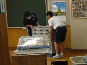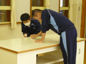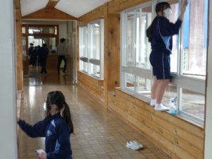 この学年のもつた〜くさんの良さ、その中に「気持ちよく働ける」ってのがあります。(ああ、人としてなんて魅力的でしょう!)この日もやはり、せっせと楽しそうに作業を進める生徒たち。机を外に出し、いつもは掃除できない場所を狙い、きれいにしてゆきます。新聞紙を布代わりに磨き上げた窓もぴかぴかで、外の雨を忘れるほどの爽快さ。その姿は、あたかも、思い出多き校舎との会話を楽しんでいるようでした。